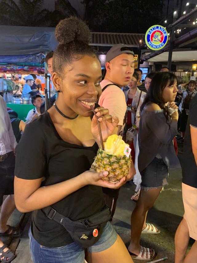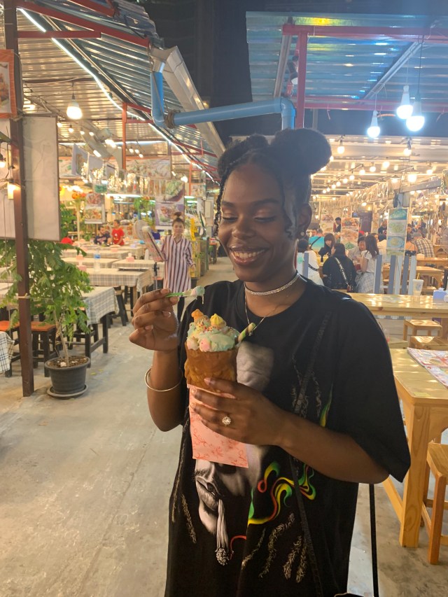 So far I’m loving it here. Tonight we went to the Neon Night market for dinner with a few people from our residence. Night markets are my jam here in Thailand. I would love to say it’s not because of the food, but that would be a lie. I like filming Judith while she tries weird things 🙂 This was our first time at the Neon night market. It was pretty, but I was still full from my lunch so I didn’t really eat. However the icecream I had was on another level. The Belgium waffle was filled with coconut and cottoncandy icecream. Sold. I’m out.